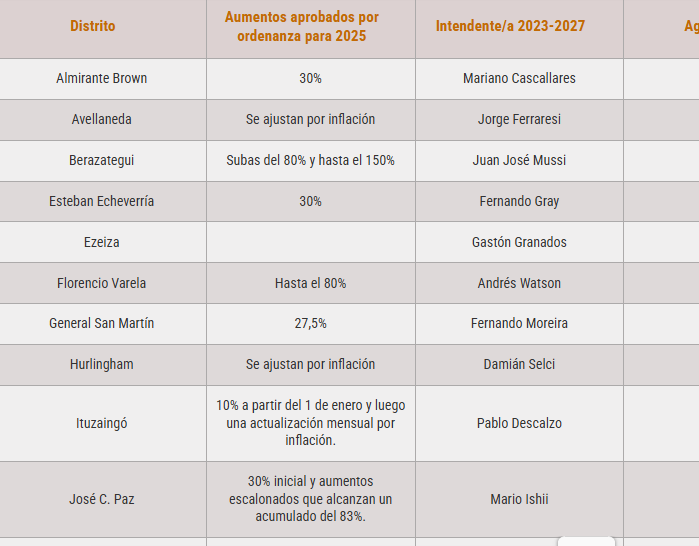 En Berazategui, sobre finales de 2024, el Concejo Deliberante - con mayoría peronista - aprobó un aumento de tasas y el Presupuesto 2025 de hasta un 80% para el ABL para el 2025, y del mismo porcentaje para las habilitaciones comerciales. Además, se habilitó al Ejecutivo local a una suba adicional de hasta el 150% a partir de marzo.